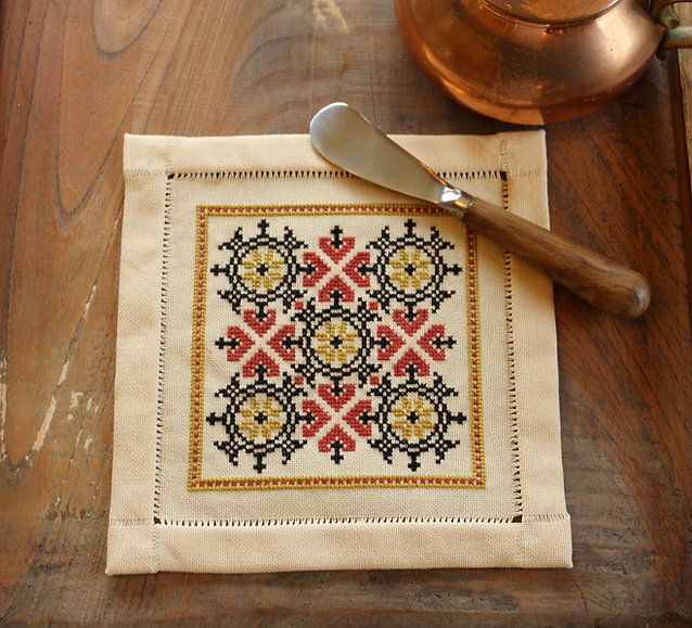 My high quality kits come with everything you need to make the embroidery in the photos–30 count Mikini 100% mercerized cotton in “sacaree” color (imported from Greece), DMC floss, full color SOC (symbol-on-chart) pattern, along with a John James size 24 tapestry needle. The raw edges of the fabric are serged for your convenience, so you can start stitching as soon as you open the kit!