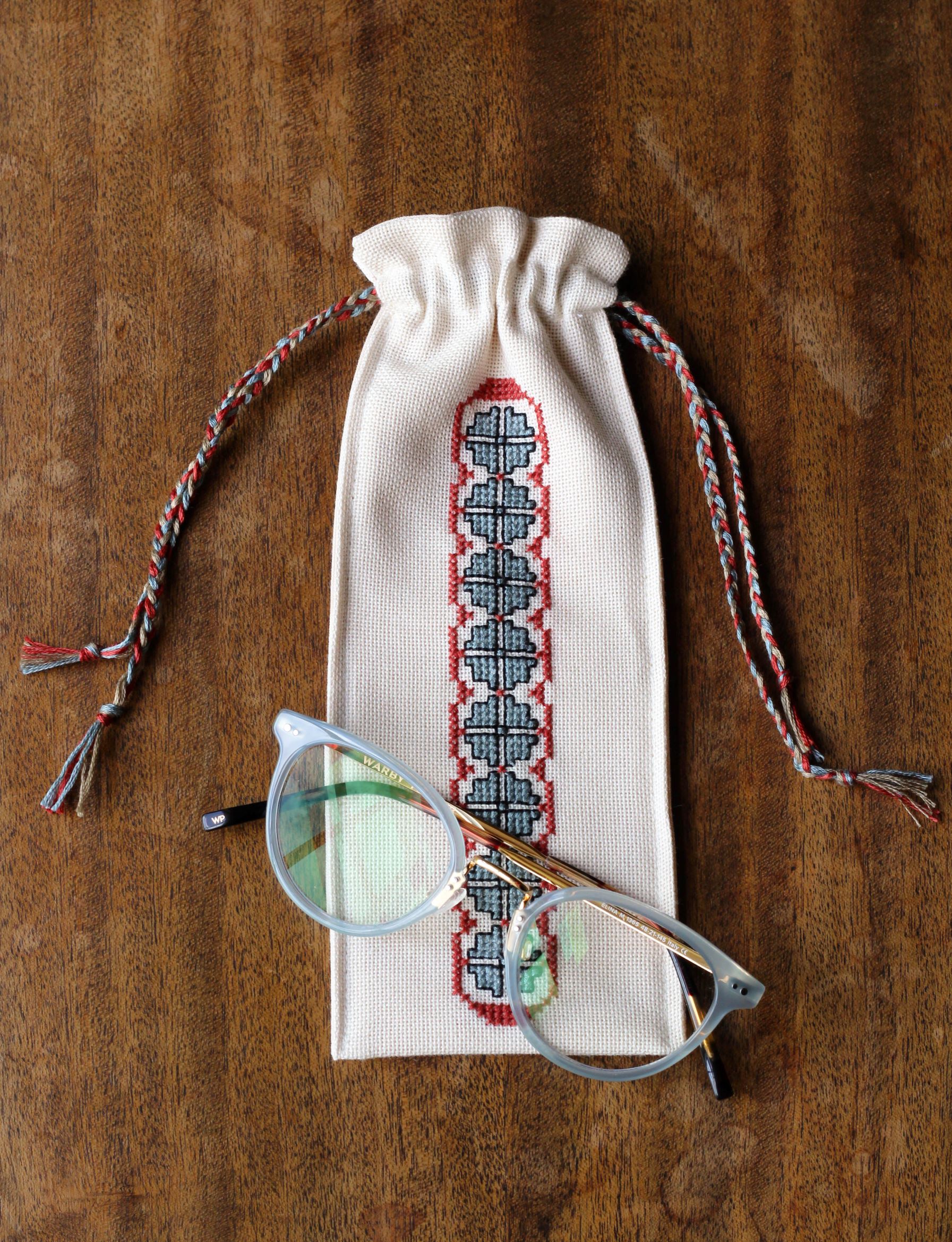 A beautiful little border of blue poppies makes a lovely eyeglass or tool kit bag. The traditional color palette of blue, red, and black is found in much ancient and Byzantine art. This kit comes with the lining fabric and instructions to make the drawstring bag as shown. The How to Sew a Drawstring Bag video on the How To page will show you how to finish this design into a drawstring bag.