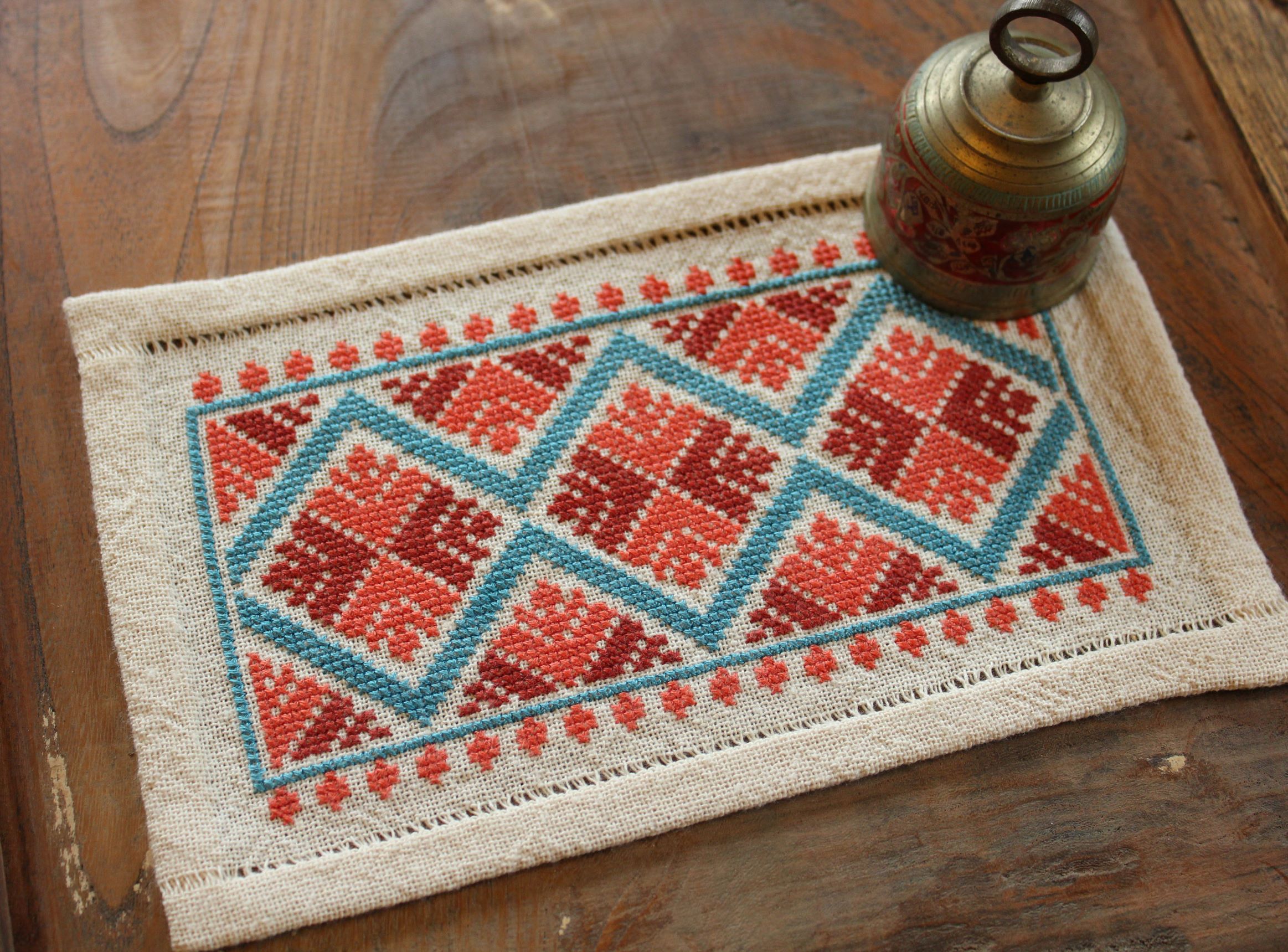 Named after the port of the Greek island of Skryos, this captivating chevron design is a beautiful example of chevron designs that were a common embroidery motif in the Sporades islands from the 16th century onwards. Often worked as cushion covers with the design worked around the perimeter of the cushion, this design works well as a smaller textile suitable for putting on your desk, dresser, or bookshelf with a small vase of fresh flowers!