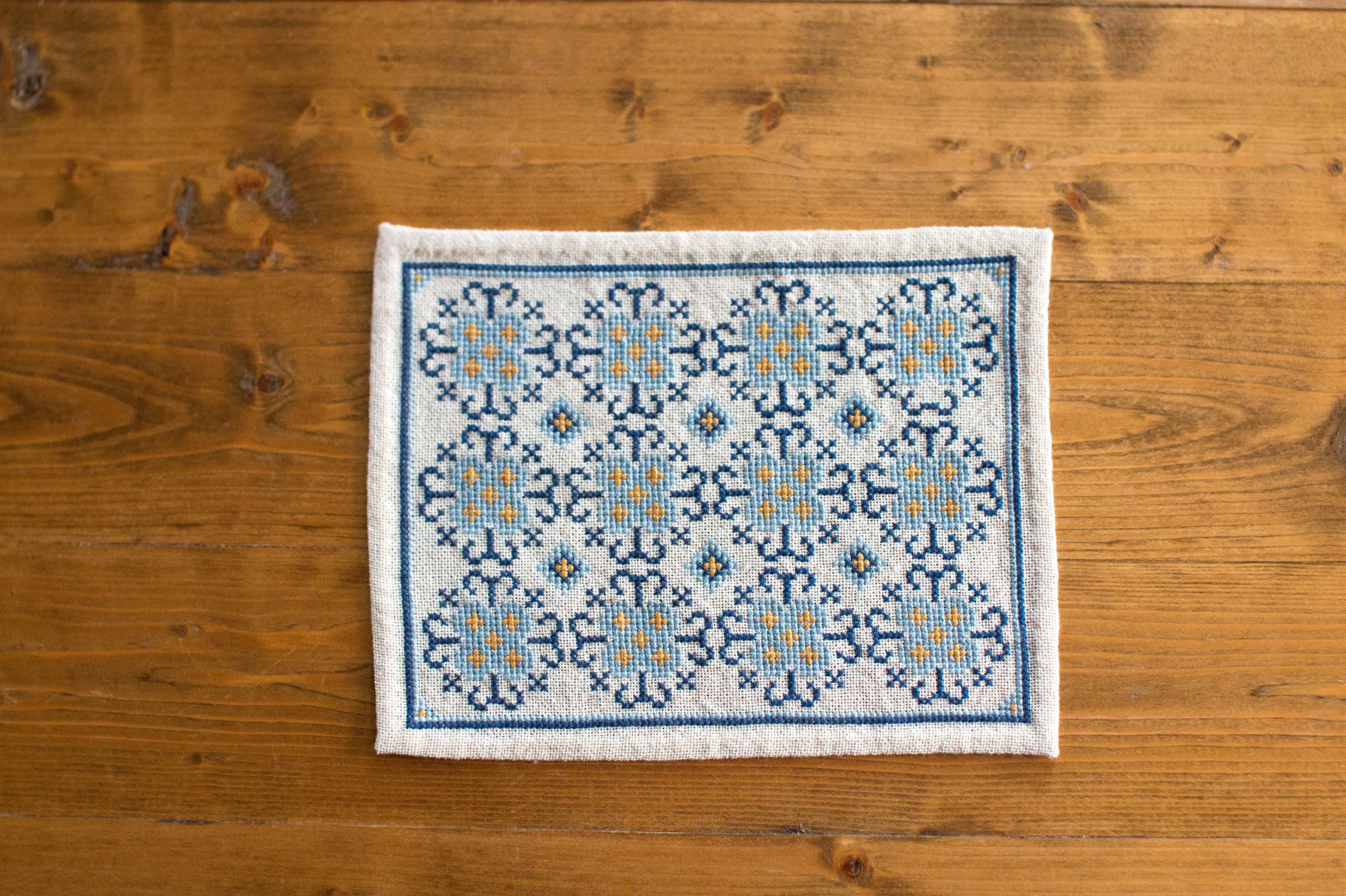 My high quality kits come with everything you need to make the embroidery in the photos–26 count 100% cotton Traditional Groundcloth (imported from Greece), DMC floss, full color SOC (symbol-on-chart) pattern, along with a John James size 24 tapestry needle. The raw edges of the fabric are serged for your convenience, so you can start stitching as soon as you open the kit!