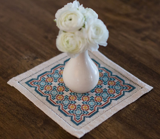 My high quality kits come with everything you need to make the embroidery in the photos–26 count 100% cotton Traditional Groundcloth (imported from Greece), DMC floss, full color SOC (symbol-on-chart) pattern, along with a John James size 24 tapestry needle. The raw edges of the fabric are serged for your convenience, so you can start stitching as soon as you open the kit!