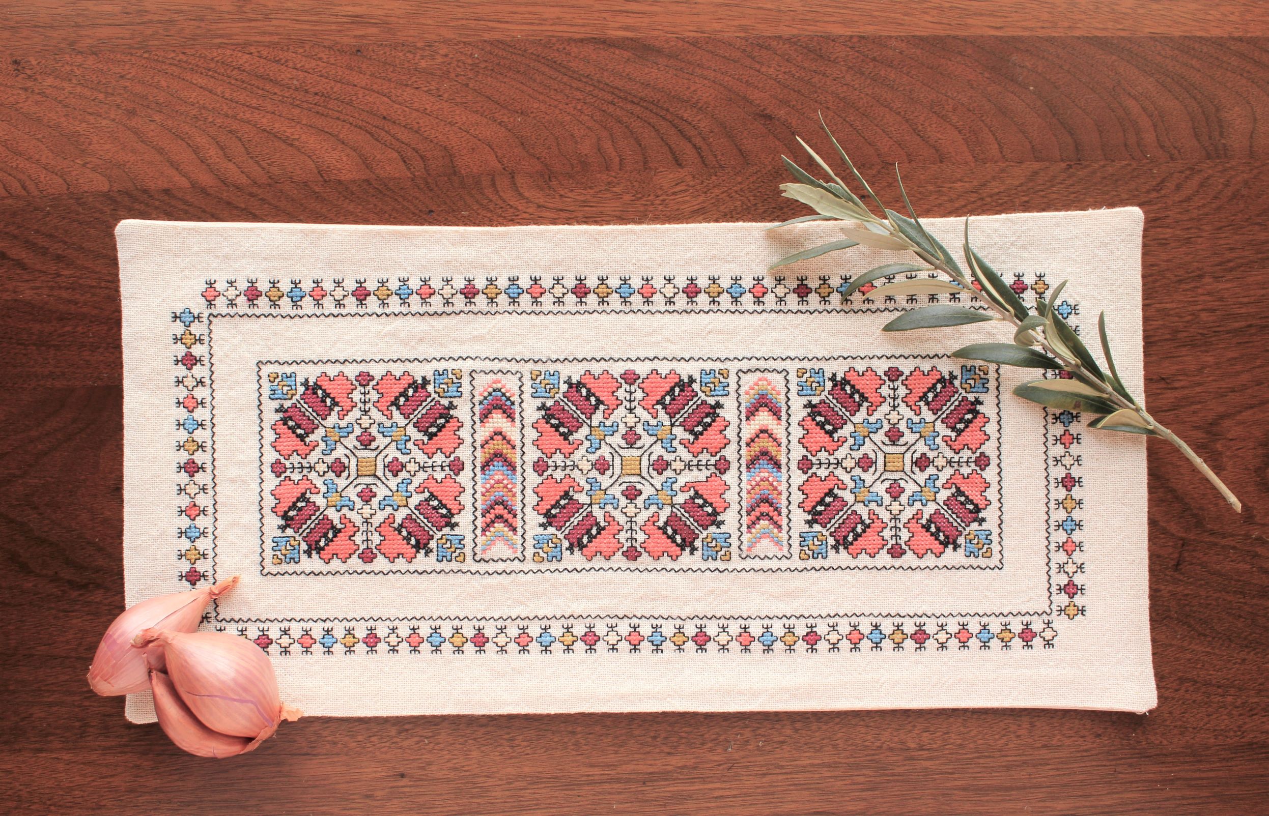 This compelling design originates in a stunning tablecloth a friend of mine shared with me. Her mother, Despina, stitched it for her prika, a collection of embroidered tablecloths, cushion covers, and other handmade textiles that family members gift to a Greek bride so she can beautify her new home, a tradition which dates back centuries in Greece.