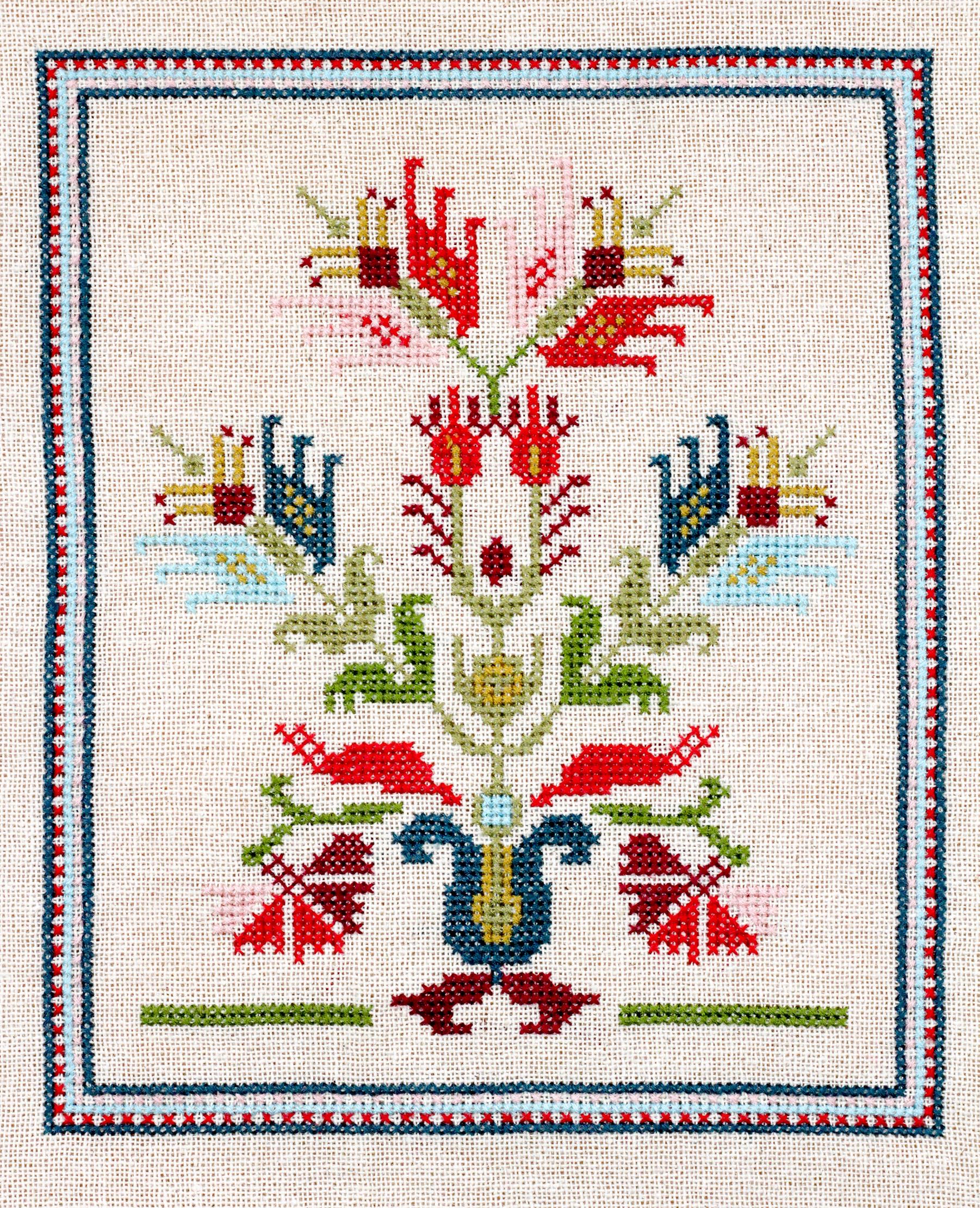 This delightful series showcases a few of the many Greek folk embroideries that feature urns and flowers. These designs are traditionally used for double-ended table runners and because of this, are typically grounded by a horizontal border formed of small geometric patterns and repeating colors.