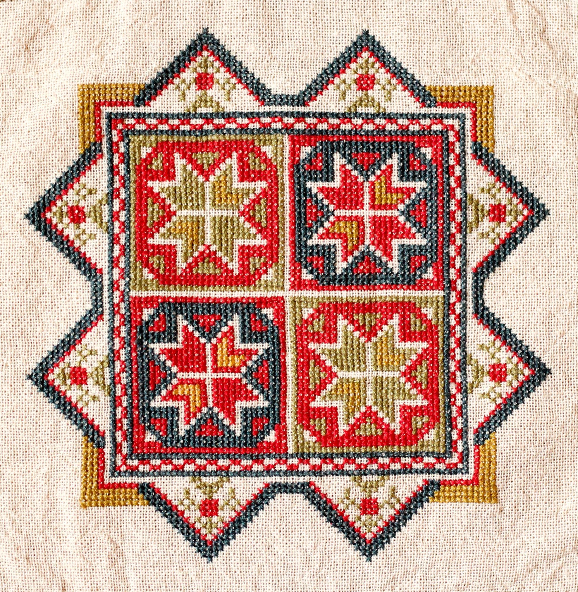 This striking design of eight-pointed stars within octagons set off by double squares is easy to work yet has a beautiful intricacy. It is based upon a textile dating to 1820 from the island of Chios, a time in which embroidery work in the Greek islands had Italianate influence. This design most likely appealed to the embroideresses of Chios because of its eight-pointed star motif which was used widely throughout Byzantine art as the number eight symbolized the “eighth day of creation,” resurrection, and new life.